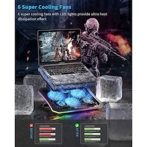 Dissipação de calor eficiente — Estruturada com geometria e painel de metal de grande orifício, 3 ventoinhas grandes (110 mm) e 3 ventoinhas pequenas (65 mm), a almofada térmica do laptop fornecerá uma quantidade impressionante de resfriamento e, ao mesmo tempo, permanecerá silenciosa durante a inicialização. A tela LCD permite controlar as luzes rgb, a velocidade e os modos do ventilador