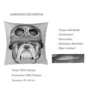 Almofada decorativa para sofa. A almofada estampada possui toque aveludado e macio. Ideal para modernizar a decoraçao da sua sala ou quarto. As almofadas com estampas divertidas, proporcionam diversao e leveza ao ambiente. O tecido em poliester é facil de lavar, resistente e bem encorpado. O ziper invisivel é discreto e excelente acabamento. As estampas de cachorro sao a escolha perfeita para quem curte uma decoraçao moderna.