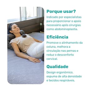 Composto por três almofadas ergonômicas, este conjunto segue recomendações de cirurgiões plásticos e fisioterapeutas para garantir o alinhamento corporal ideal e a redução de riscos durante o repouso.