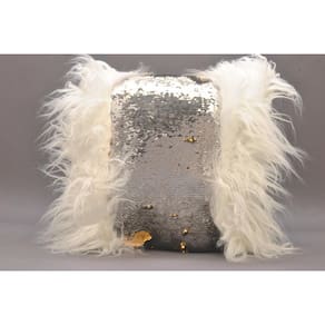Almofada Pelo Longo Branco Com Paetê Dourado E Prata Moda Nossa linda almofada agora se juntou a nossa Almofada mágica, isso mesmo 2 em 1, além de ter uma maravilhosa almofada mágica conta com bastante estilo com os pelos na sua lateral, esbanjam charme e conforto por qualquer cômodo da casa, está esperando o que pra garantir a sua! - Dimensões do produto: 45x45x15 - Cor: Paetê Prata/ Dourado - Pelo: Branco - Já vai com o enchimento