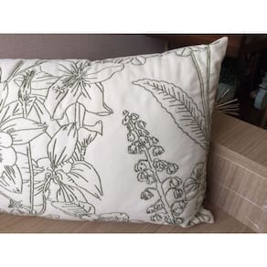 Almofada em sarja bege com bordado fino em formato de pincel na cor verde, medindo 35 x 52 cm. Sofisticada e versátil, é perfeita para adicionar textura e elegância à decoração de sofás, poltronas ou camas.