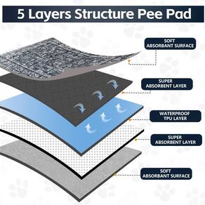 - As almofadas espessas de xixi para cães são feitas de quatro camadas de material. Superfície de flanela super absorvente, macia e respirável. 100% TPU à prova d'água e à prova de vazamentos, impermeável 24 horas. Estas almofadas antiderrapantes para filhotes podem absorver imediatamente a água para proteger seu chão ou carpete do odor de manchas de urina de cães e criar um lar limpo e seco para cães.