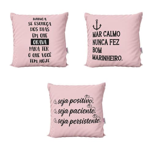 Almofadas Personalizadas Rosa com Frases Nunca se Esqueça Para Sofá 40x40 - Novadecora Decorar sua casa com lindas Almofadas é aliar conforto e personalidade. E não existe sensação melhor do que poder chegar em casa depois de um dia cansativo de trabalho e curtir o aconchego do nosso lar. E por falar em aconchego, um item que transmite muito bem isso são as Almofadas Decorativas que você encontra na Novadecora. Se você é daqueles que adora decoração e gosta de deixar a sua casa com a sua personalidade, aqui na Novadecora é o lugar ideal para encontrar as almofadas mais lindas, dos mais variados estilos. Kit Com 3 Almofadas Decorativas em impressão digital com estampa exclusiva frente e verso TECIDO Capa confeccionada em tecido Oxford 100% poliéster, um tecido de ótima qualidade e durabilidade. O Oxford proporciona mais conforto e um toque agradável, além das cores ficarem mais vivas deixando seu ambiente mais decorado. Características e especificações: Marca: Novadecora Almofada já cheia Pronta para uso Almofada lavável - sem perder a qualidade e impressão Zíper invisível Dimensões lxa 40x40 cm É produto personalizado: Sim Conteúdo da embalagem 3 almofadas com enchimentos Importante sobre lavagem: - Lavar manualmente com sabão neutro - Temperatura máxima de lavagem 40°C. - Não usar alvejante. - Secar a sombra. - Temperatura máxima de base do ferro 110°C. - Não limpar a seco. Garantia: Três meses contra defeitos de fabricação. As cores das estampas podem variar de acordo com a calibração do seu monitor. AVISO: Não nos responsabilizaremos pela diferença de cores em caso de pedidos feitos separadamente, no caso produzidos em lotes diferentes. Marca: Novadecora