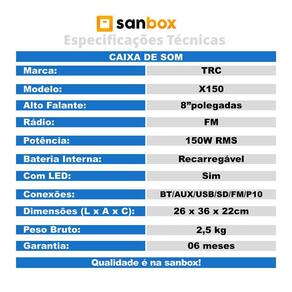 São 150W RMS de pura potência, equipada com alto falante de 8” polegadas e uma iluminação LED na parte frontal. Além disso, a caixa de som TRC X150 possui uma bateria embutida recarregável, mas pode também ser utilizada diretamente na tomada.