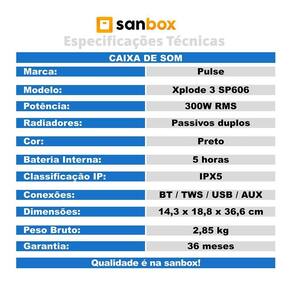 Alto-Falante Bluetooth Portátil Xplode 3 Sp606- 300W RmsO alto-falante bluetooth portátil com led pulse xplode 3 sp606- 300w rms é a opção perfeita para aqueles que desejam adquirir um aparelho de som totalmente portátil, capaz de entregar uma alta definição sonora, com duplo radiadores passivos que proporciona graves realçados e sem ruídos para você curtir cada momento. Versatilidade o modelo sp606 oferece conexões como bluetooth e a tão renomada tecnologia tws, onde você consegue emparelhar duas xplode 3 para amplificar os canais de áudio e criar uma maior imersão ao escutar suas músicas favoritas. Tudo isso sem a necessidade de cabos. Mas você também pode aproveitar suas músicas utilizando as conexões aux e usb. Anime ainda mais a suas festas com as luzes de led decorativas da xplode 3. Além disso, a caixa conta com uma alça para facilitar o transporte e base de apoio. Equipada com 300w rms de pura potência essa caixinha de som da pulse possui uma bateria interna recarregável com capacidade de 3600mah e uma autonomia de até 5 horas em uso para você aproveitar ao máximo sua playlist, sem precisar se preocupar com o tempo. Função hands-free equipada com microfones embutido para você atender ou encerrar ligações do seu celular diretamente da caixa de som com apenas um toque Preparada para suas festas na piscina o modelo de caixa xplode 3 possui classificação de proteção ipx5, que pode suportar respingos, gotas em direções variadas e até jatos d'água ou poeira de baixa pressão. Vale ressaltar, que essa caixa de som não pode ser imersa em poças d'água, banheira ou ser exposta a jatos constantes de água como chuvas, chuveiro e mangueiras. Use-o onde quiser, este dispositivo é projetado para você ter sempre a melhor experiência sonora, com garantia de qualidade pulse. Especificações técnicas: -marca: pulse -modelo: sp606 -gtin/ ean: 7908414458680 -cor: preto -design: portátil -sistema de iluminação: led decorativo -potência: 300w rms -radiadores: passivos duplos -frequência na saída: 80hz 15khz -impedância: 4 ohms -função bluetooth: sim -função hands-free: sim -função tws: sim -bateria interna: sim -capacidade da bateria: 3600mah / 7,4v -autonomia da bateria: 5 horas -tempo para recarga: 6 horas -resistente a água: sim -classificação ip : ipx5 -controle remoto: não -conexões entradas : bt / tws / usb / aux -entrada auxiliar: p2 3.5mm -alça de transporte: sim -dimensões l x a x c : 14,3 x 18,8 x 36,6 cm -peso: 2,57 kg -peso bruto: 2,85 kg Itens inclusos: -01 pulse xplode 3 sp606 -01 cabo para recarga tipo c -01 manual Garantia: -garantia de fábrica: 36 mesesCódigo ANATEL: 02114-22-03111 Homologação Anatel: 080281811799