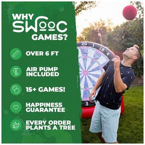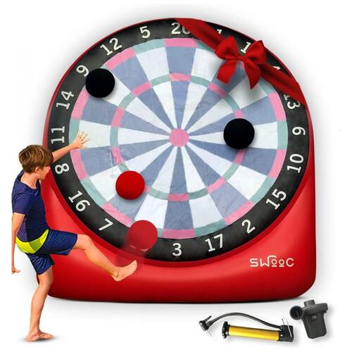 TUDO ESTÁ INCLUÍDO Inclui 1 enorme alvo de dardos de futebol inflável, 2 bolas de chute vermelhas, 2 bolas de chute pretas, 1 bomba de kickball, 1 bomba de ar elétrica para alvo de dardos, 4 estacas de solo e um cartão de pontuação reutilizável para apagar a seco com caneta.