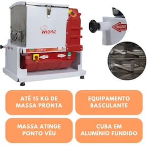 Masseira tem tacho em alumínio fundido e motor 1/2 CV, seus misturadores em alumínio e com capacidade de 15kg de massa pronta.
