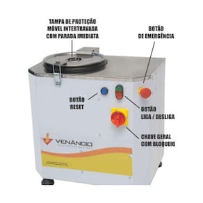 A Amassadeira Industrial conta com tampa de proteção móvel em aço inox com orifício central e trava intertravada através de duas chaves eletromecânicas com acionamento individual atuando na proteção do equipamento. Sua cuba de aço inox conta com batedor de ferro fundido modular estanhado e toda sua estrutura é feita de chapa reforçada SAE1010/1020 com acabamento em pintura a pó eletrostática com base fosfatizada.