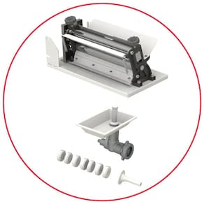 - Kit extrusora de massas, moedor de carne e cilindro laminador com 28 cm de larguraExtrusora para 5 tipos de massas e 2 tipos de biscoitos;