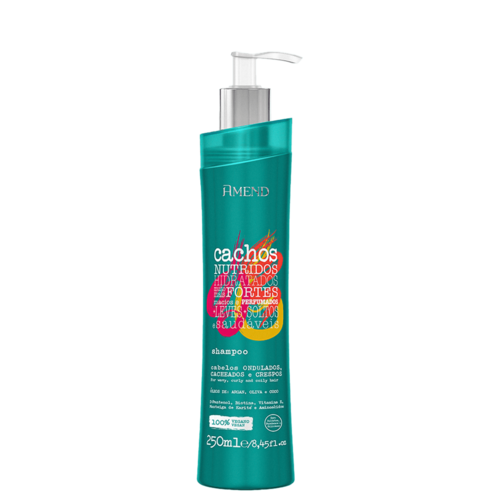 Shampoo para cabelos ondulados, cacheados e crespos. Amend Cachos Shampoo nutre, restaura e regenera os fios enquanto faz uma limpeza suave, que respeita a integridade dos cachos.