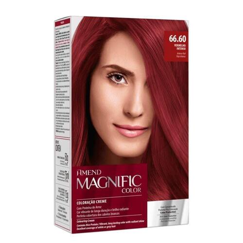 Amend Magnific Tinta 66.60 Vermelho Intenso DESCRIÇÃO:Tintura Magnific Color Vermelho Intenso 66.60 Amend traz tons vibrantes que promovem cobertura perfeita dos fios brancos. Coloração permanente em creme.AÇÃO/ATIVOS:Sua fórmula é enriquecida com proteína do Arroz que possui efeito restaurador e protetor, ou seja, a cor do seu cabelo é renovada e a estrutura capilar preservada. Garante longa duração, além de proporcionar brilho radiante e maciez enquanto colore os fios. Imagem meramente ilustrativa. O produto pode ter variação de cor ou desenho, porém as características gerais são as mesmas especificadas na descrição do produto.MODO DE USAR:Coloque as luvas. Despeje todo o conteúdo da bisnaga de Coloração Creme dentro do frasco aplicador de Emulsão Reveladora. Feche a tampa do frasco aplicador e agite bem até obter uma emulsão homogênea. Quebre imperativamente a ponta do frasco aplicador imediatamente após ter agitado a mistura, a fim de evitar projeções indesejadas do produto ou estourar o frasco. Aplique a emulsão homogênea nos cabelos, começando pela raiz nos cabelos secos até as pontas. Massageie o cabelo até que a coloração esteja bem distribuída. Deixe agir por cerca de 35 minutos, em seguida enxágue com água em abundância até remover todos os resíduos. Finalize como desejar.ESTE ANÚNCIO CONTÉM: 01 UNIDADE DE AMEND MAGNIFIC 66.60 VERMELHO INTENSOAmend Magnific Tinta 66.60 Vermelho Intenso