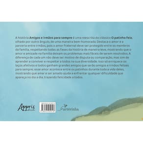 A história Amigos e irmãos para sempre é uma reescrita do clássico O patinho feio, olhado por outro ângulo, de uma maneira bem-humorada. Destaca o amor e a parceria entre irmãos, pois o amor fraternal deve ser protegido entre os membros da família, respeitando todas as fases da história de maneira leve, mostrando que o amor e amizade na família deixam os problemas mais fáceis de serem resolvidos. A diferença de cada um não deve ser motivo de disputa ou comparação, mas sim de aprender a conviver e respeitar a todos na sua diversidade. Isso só enriquece os laços afetivos e todos ganham grandes amigos que serão amigos e irmãos felizes para sempre; esse amor acontece entre os patinhos durante toda a vida deles, mostrando que amar e ser amado ajuda a enfrentar qualquer di?culdade que apareça no dia a dia, trazendo felicidade a todos.