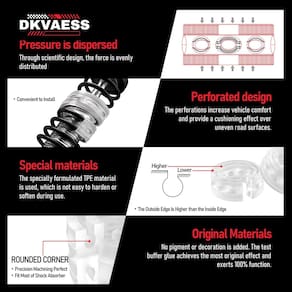 Características: 1. Resolve efetivamente o problema de fraqueza das molas quando carga pesada e melhora o desempenho do amortecedor. 2. Melhora o conforto de condução e mais estável durante as curvas. 3. Reduza o bombeamento do absorvente ao passar pela corcunda da estrada ou linha amarela. 4. Reduz o ruído e a vibração durante a viagem. 5. Protege o amortecedor e o sistema de suspensão para evitar vazamento de óleo. 6. Prolonga a vida útil do absorvente mais de 2 vezes. 7. Melhora a eficiência de frenagem. 8. Tamanho para todos os tipos de carro, incluindo mola abaixada e ajustável. A/B/C/D/E/F. Tipo: Tipo A -- Abertura: 47 mm Espessura: 13 mm Altura: 75 mm Diâmetro: 173 mm Tipo B -- Abertura: 37 mm Espessura: 13 mm Altura: 65 mm Diâmetro: 160 mm Tipo C -- Abertura: 27 mm Espessura: 10 mm Altura: 55 mm Diâmetro: 131 mm Tipo D -- Abertura: 23 mm Espessura: 10 mm Altura: 48 mm Diâmetro: 113 mm Tipo E -- Abertura: 15 mm Espessura: 9 mm Altura: 39 mm Diâmetro: 112 mm Tipo F -- Abertura: 12 mm Espessura: 15 mm Altura: 38 mm Diâmetro: 120 mm Dicas de instalação: 1. Levante o carro até que a mola seja totalmente estendida. 2. Limpe a mola e, em seguida, borrife um pouco de água ou óleo nela (para facilitar a instalação dos amortecedores) 3. Instale os amortecedores. Normalmente, o amortecedor é instalado na altura média da mola Incluído na embalagem: 1 conjunto (2 peças) x almofada de mola para amortecedor - Antes da instalação: meça a distância da mola (H2) quando o carro estiver parado (não é necessário usar um macaco ou outras ferramentas para levantá-lo). Depois de medir os dados, use um macaco para levantar o veículo e relaxar completamente a mola. Meça o espaço entre as molas (H2) e selecione o tamanho apropriado para suporte extra. Escolha o tamanho (A+) do amortecedor de borracha, se a folga da mola da bobina do carro (quando levantada e descarregada) estiver entre 6 e 9 cm - Resolve efetivamente o problema de fraqueza das molas quando carga pesada e melhora o desempenho do amortecedor. - Melhora o conforto de condução e mais estável durante as curvas. - Reduza o bombeamento do absorvente ao passar pela corcunda da estrada ou linha amarela. - Reduz o ruído e a vibração durante a viagem.