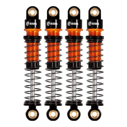 NOTA: Use óleo de choque (não incluído) para adicionar apenas óleo suficiente para um revestimento pesado. Não encha totalmente o corpo do choque. Especificações: Material: Alumínio Cor: dourado Comprimento total: 50,5 mm (1,99 pol.) Comprimento estendido (olho a olho): 45 mm (1,77 pol.) Tamanho comprimido (olho a olho): 31 mm (1,23 pol.) Viagem máxima: 14 mm (0,56 pol.) Cada peso: 2 g - Os amortecedores de viagem longos INJORA Axial FCX24 com rosca de alumínio são uma ótima opção para adicionar viagens ao seu FCX24. - Estes amortecedores são usinados a partir de alumínio e apresentam corpos roscados para ajustes rápidos de pré-carga. - Três taxas de mola estão incluídas, permitindo que você ajuste esses amortecedores no seu chassi. - Internamente, eles usam óleo de choque (não incluído) em vez do típico amortecimento por fricção e empregam vedações da bexiga para amortecimento consistente de rebote. - O acabamento dos amortecedores é bom, sem corrosão e combina muito bem com outras atualizações INJORA