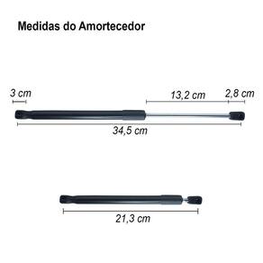 Pesos e medidas (aproximados) Comprimento fechado de centro a centro de montagem: 21,3 cm Comprimento aberto de centro a centro de montagem: 34,5 cm Curso: 13,2 cm Força de expansão: 350 N Medidas da embalagem: 3 x 6 x 58 cm (altura x largura x comprimento) Peso bruto: 0,35 Kg