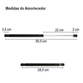 Pesos e medidas (aproximados) Comprimento fechado de centro a centro de montagem: 28,5 cm Comprimento aberto de centro a centro de montagem: 50,5 cm Curso: 22,0 cm Força de expansão: 350 N Medidas da embalagem: 3 x 6 x 61 cm (altura x largura x comprimento) Peso bruto: 0,29 Kg