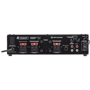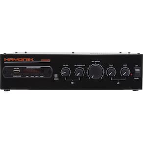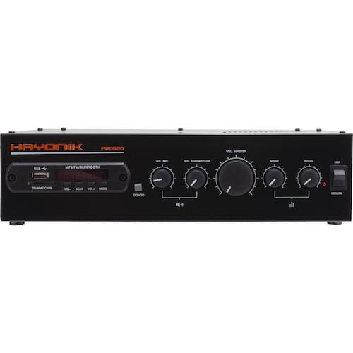 DESCRIÇÃO Modelo:versátil PRO-620 Marca:hayonik O VERSÁTIL PRO-620 é a solução para a amplificação para seu sistema de som ambiente Utilizado para sonorizar diversos ambientes tais como estabelecimentos comerciais, escritórios, clínicas e até mesmo em casa ou em áreas de lazer. Possui Bluetooth integrado para facilitar a transmissão de músicas direto de seu Smartphone. Além disso, possui ainda entrada para dispositivos USB e SD na parte frontal e entrada P10 para microfones e RCA na parte traseira do produto. Em seu controle, possui o botão EQ que permite escolher entre as equalizações Grave, Pop, Jazz, Clássica e Country. CARACTERÍSTICAS Classe:ab Canais:1 Canal com saída para 4 Ohms (2 caixas de 8 Ohms em paralelo); 1 Canal com saída 0,8 Ohms para até 10 caixas de 8 Ohms ligadas em paralelo; 1 Canal 70V. Potência:100w RMS Impedância:0,8 Ohms, 4 Ohms ou 70V Entradas:entrada USB; Entrada para cartão SD; Entrada para microfone (P10); Entrada auxiliar (RCA). Saídas:borne Dimensões:axlxp: 80 x 210 x 300 mm THD:0,01% Sensibilidade:microfone/guitar: 15mV Auxiliar: 250mV Equalização:knob de equalização Grave e Agudo; Equalizações presets: Grave, Pop, Jazz, Clássica e Country Alimentação:127 ou 220 ~VAC / Seleção Automática Peso:3,5kg Consumo de Energia:120VA (Máximo)
