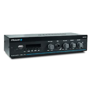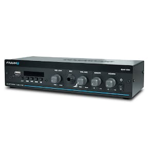 O amplificador Slim 1000 App G5 da Frahm possui 40 Watts RMS de potência e é ideal para pequenos ambientes. Possui entradas USB, SD Card, auxiliar (RCA), Microfone, Rádio FM e Bluetooth.