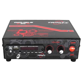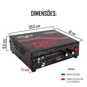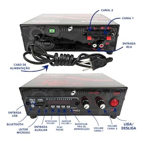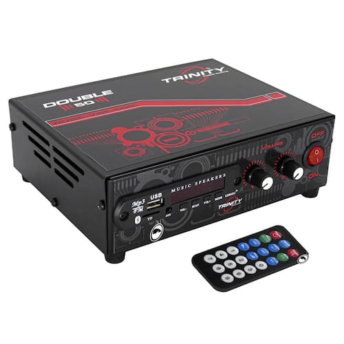 DESCRIÇÃO: Agora você pode curtir sua própria música com uma super potência e o menor custo do mercado. O Amplificador Double 50 está mais potente. Agora com Bluetooth, ouça suas músicas e escute suas ligações direto do amplificador. Além disso, possui entrada USB, entrada para cartão de memória e entrada RCA para que você desfrute suas músicas favoritas e Rádio FM para você poder ouvir sua rádio preferida. Um excelente amplificador de mesa que pode ser utilizado para tocar seu som onde você estiver.