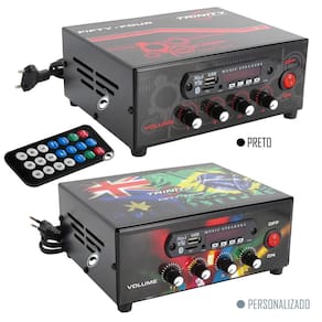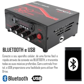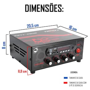 ESPECIFICAÇÕES TÉCNICAS: - USB - Radio FM, Bluetooth, MP3, SD CARD - 4 Canais de 50W RMS Musical - 4 Ohms (impedância mínima) - 4 Ajuste de volume - independente por canal - 1 Cooler 40x40x10 - Entrada RCA - Alimentação 110 ou 220V A/C 60Hz (Bivolt Automático) - Chave liga/desliga frontal - Altura: 8 cm - Largura: 16 cm - Comprimento: 25,5 cm - Acompanha 1 Controle remoto