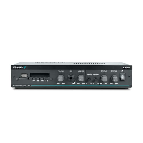O amplificador Slim 1600 G5 com 60 Watts RMS de potência, possui 2 canais e de 30W e cada canal aceita qualquer número de caixas de sobrepor ou caixas de embutir inferiores a 6. Indicação de uso: Recepções, clínicas, conveniências, farmácias, lojas e muitos outros. Facilidade em sua operação, possibilita comando de funções via aplicativo Frahm. Possui conexão USB, SD Card, auxiliar via RCA/P2, entrada para Microfone ( P10 ), Rádio FM e Bluetooth