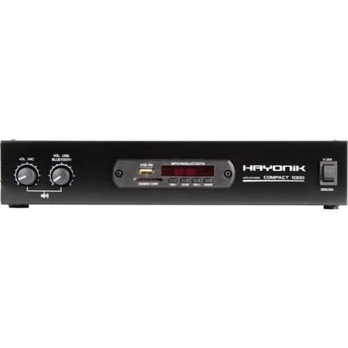 Amplificador hayonik compact 1000 80w rms com bluetooth O amplificador hayonik compact 1000 é um modelo versátil, prático e de fácil manuseio. Possui entrada usb, sd, aux rca, microfone, rádio fm e bluetooth. É leve, compacto e de fácil instalação. Além disso, ele é o modelo ideal para quem busca praticidade e qualidade por um baixo custo. Equalização:volume mic, volume aux Alimentação:bivolt Peso:1,76kg Consumo de energia:160va Classe:ab Canais:4 Potência:80w rms Impedância:4 ohms Entradas:p10 mono/rca Saídas:até 8 caixas de 8 ohms 2 por canal Dimensões:78 x 310 x 210mm Thd:0,05% Pesquisa:amplificadorhayonikamplificador compactpotencia Modos: usb, sd, bluetooth, fm Tensão de rede: 100 a 240vac 60hz Controle remoto: sim Sensibilidade: microfone/guitarra 15mv Auxiliar 250mv Conteúdo da embalagem: 01 amplificador compact 1000 01 manual do proprietário e o certificado de 01 controle remoto 01 bateria para controle remoto Homologação da anatel: 05 150 -18 - 11597 Homologação Anatel: 112572013224 Marca: Não Informado Ean: 7899638111713