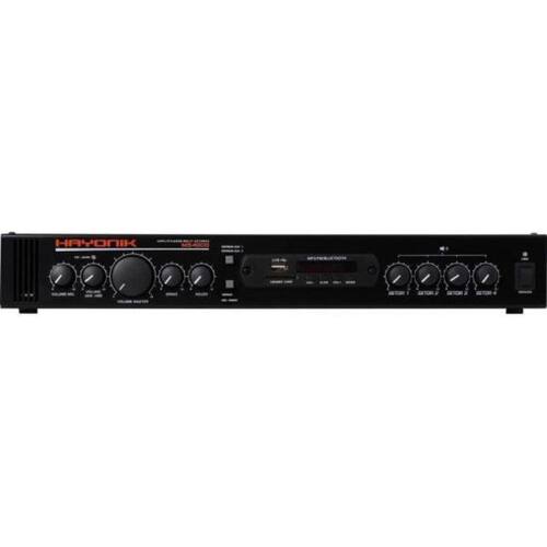 O amplificador para ambientes Hayonik MS4000, permite ao usuário controlar individualmente o volume de até 4 setores. Com 400W de potência RMS, é ideal para todos os tipos de ambiente. Possui entrada de microfone, entrada USB para pen-drive, Rádio FM, Conexão Bluetooth, Entrada SD CARD, Entrada para Microfone e duas entradas auxiliares RCA para aparelhos eletrônicos. Possui também a função GONGO ELETRÔNICO, que quando acionado emite um alerta para uma mensagem. Este amplificador permite ainda a expansão para mais canais conforme a necessidade do cliente. Utilizando-se o EMS4000 Hayonik. produto vendido separadamente .