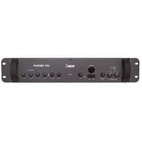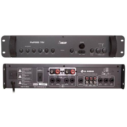 Amplificador para sonorização ambiente, podendo trabalhar em 4 ohms 300 + 300w rms ou 70 volts 300w rms . Gongo ding-dong c.V.I. Especificações técnicasEntradas: 2 microfones mic1 e mic2 com a função mic priority m.P. E c.V.I. 1 microfones mic3 p10 c.V.I. 2 entradas auxiliares in com conectores p10 canais l/r 2 entradas auxiliares a1 e a2 com conectores rca estéreo s.A E c.V.I. Saídas: 2 send com conector p10 1 remote aciona o gongo a distancia 1 auxiliar line out com 2 conectores rca mono 2 output a e output b com borne positivo e negativo e c.V.I. 1 saída 70v quando output a e output b são ligadas em bridge caixas com trafo de linha 70v respeitando potência máxima e perdas com cabos. Equalizador: 3 bandas - low, mid, high Consumo total à potência máxima: 840 w rms Proteção: alto-falantes / fusível / overload - sobrecarga e curto Alimentação:127/220v Dimensões mm : l 485 x h 90 x p 425 Peso kg : 7,8
