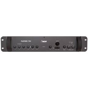Amplificador para sonorização ambiente, podendo trabalhar em 4 ohms 300 + 300w rms ou 70 volts 300w rms . Gongo ding-dong c.V.I. Especificações técnicas Entradas: 2 microfones mic1 e mic2 com a função mic priority m.P. E c.V.I. 1 microfones mic3 p10 c.V.I. 2 entradas auxiliares in com conectores p10 canais l/r 2 entradas auxiliares a1 e a2 com conectores rca estéreo s.A E c.V.I. Saídas: 2 send com conector p10 1 remote aciona o gongo a distancia 1 auxiliar line out com 2 conectores rca mono 2 output a e output b com borne positivo e negativo e c.V.I. 1 saída 70v quando output a e output b são ligadas em bridge caixas com trafo de linha 70v respeitando potência máxima e perdas com cabos. Equalizador: 3 bandas - low, mid, high Consumo total à potência máxima: 840 w rms Proteção: alto-falantes / fusível / overload - sobrecarga e curto Alimentação:127/220v Dimensões mm : l 485 x h 90 x p 425 Peso kg : 7,8 Homologação Anatel: 170222003229 Ean: 7908481203152