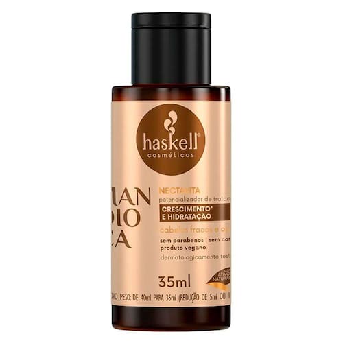 A Ampola Capilar Haskell Nectavita Mandioca é indicada para todos os tipos de cabelo. Fortalece, hidrata, reduz volume, devolve o brilho e protege contra o ressecamento dos fios. Possui fórmula enriquecida com óleo de mamona que fortalece os fios e tem alto poder hidratante, e também vitamina E, que combate o envelhecimento dos fios. Além disso, possui ainda extrato de mandioca, que é rica em vitaminas e nutrientes essenciais à nutrição dos fios, proporciona hidratação profunda da fibra capilar, resultando em maciez e brilho, o que realça a beleza dos cabelos.