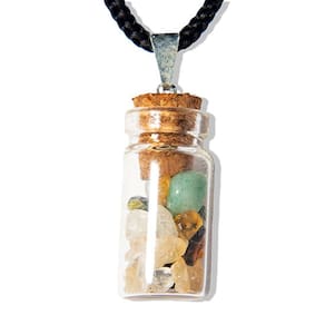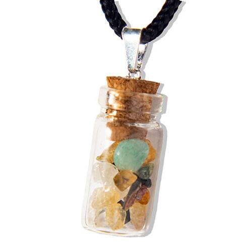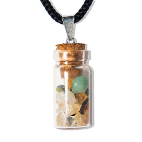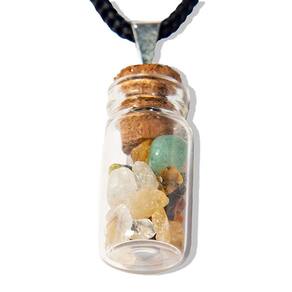 Amuleto de cura emocional e espiritual para quem o utiliza. Presilha prateada com pedrinhas de diversas pedras dentro da garrafinha de vidro.