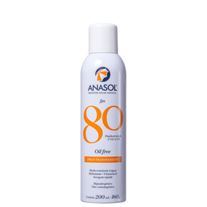 O Protetor Solar Spray Transparente FPS 80, da Anasol, é totalmente transparente com textura leve que seca rapidamente ao aplicar na pele, sem deixar traços brancos.