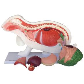 Modelo da anatomia do coelho em 9 partes com musculatura. O modelo apresenta com riqueza de detalhes estruturas anatômicas. O modelo apresenta regiões especificas numeradas para estudo. Confeccionado em resina plástica de alta qualidade, montado sobre base.