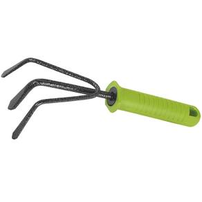 Ancinho pequeno de 3 dentes com cabo em plástico. A largura é de 100 mm e o comprimento total de 225 mm. Projetado para afofar o solo e fazer aeração em canteiros de horta e flores pequenos, feita de aço ?8 e pintada de esmalte de efeito do martelo para impedir corrosão. Após o uso é preciso limpar a ferramenta de resíduos do solo e de outro lixo.