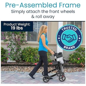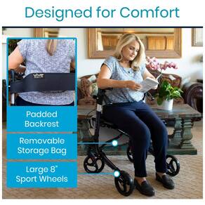 SUPORTE E ESTABILIDADE SUPERIORES Resistente e durável, o andarilho Vive oferece suporte estável, manobrando facilmente sobre qualquer tipo de superfície com grandes rodas esportivas de . A altura da alça é ajustável para um ajuste personalizado para cada indivíduo. Suportando até 136 kg, a estrutura de alumínio é resistente à corrosão e dobra para fácil zenamento e transporte. Inclui um assento e encosto largos para descansar confortavelmente em movimento. DESIGN DOBRÁVEL COMPACTO O andarilho dobrável é compacto quando dobrado, cabendo facilmente no porta malas de um carro ou até mesmo no banco traseiro. Dobragem sem complicações em uma etapa fácil. Basta puxar a alça central sob o assento. Para zenamento mais compacto, as rodas dianteiras são removíveis com um simples botão de liberação e as rodas traseiras são articuladas para dobrar contra o quadro. Ele pesa apenas 20 quilos. SISTEMA DE FREIO DUPLO Cada uma das alças ergonômicas é angulada para posicionar as mãos em uma posição neutra, reduzindo a fadiga e permitindo fácil acesso aos freios de mão estilo bicicleta. Os freios de travamento das rodas garantem que o andarilho não se mova quando ativado Marca: Não Informado