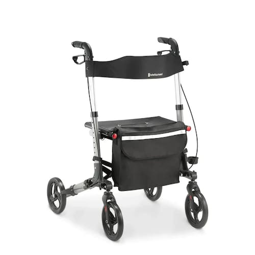 Andador Alumínio Compacto Dellamed D14 com 4 Rodas, Assento Acolchoado, Encosto, Bolsa Porta Objetos, Altura Regulável Até 135kg e Freios Individuais - Preto