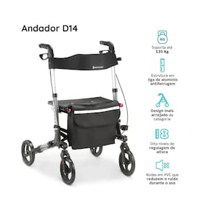 -Auxilia em alterações de equilíbrio e de locomoção, oferecendo apoio e suporte ao usuário; -Dobrável, desmontável e fácil de montar; -Possui suporte de bengala ou guarda-chuva; -Altura ajustável em 7 níveis com pino click; -Bolsa porta-objetos com capacidade de até 5 kg; -Freios individuais nas rodas traseiras; -Segurança: com faixa reflexiva, olho de gato e freios de serviço e de estacionamento; -Mais conforto: assento acolchoado e manoplas ergonômicas; -Rodas silenciosas que aumentam o conforto no andar.