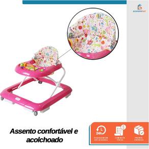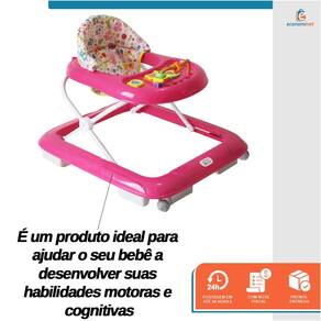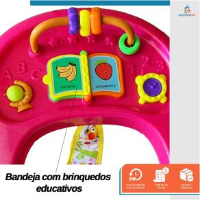 Características: Estrutura em plástico resistente Assento confortável e acolchoado Bandeja com brinquedos que produzem som e luzes Rodas com freios para maior segurança 3 alturas ajustáveis para acompanhar o crescimento do bebê Dobrável e compacto para fácil armazenamento