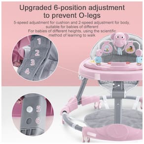 Altura Ajustável O andador possui 2 posições de altura ajustável e 4 posições de altura do assento, permitindo manter o bebê na altura ideal para cada fase do crescimento. Isso ajuda a prevenir pernas em "O". Perfeito para meninos e meninas.