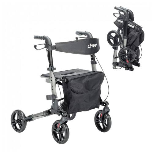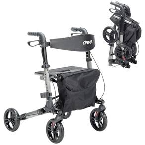 O Andador Dobrável Compacto da Drive Medical é fabricado em alumínio leve e resistente, com estrutura de 4 rodas de 20 cm de diâmetro para navegação em superfícies internas e externas variadas. O sistema de dobragem permite redução para dimensões compactas, facilitando armazenamento e transporte em espaços reduzidos. Os punhos ajustáveis oferecem personalização de altura para adaptação ergonômica ao usuário.