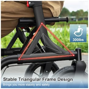 Rodas de Borracha de 12 Polegadas: O andador MAXWALK possui rodas grandes (12" na frente, 10" atrás) com giro de 360° para rolamento suave. As rodas são antiderrapantes, com absorção de choque, ideais para ambientes externos, como estradas esburacadas, cascalho, concreto, grama e outros terrenos irregulares.