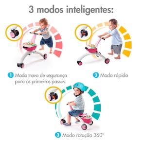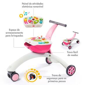 Andador Infantil - 5 em 1 - Triciclo - Rosa - Tiny Love: O Andador e Triciclo 5-em-1 da Tiny Love possui todos os principais recursos para mobilidade em um único produto, além de um mecanismo de controle de velocidade para garantir que o bebê tenha segurança em seus primeiros passos. Também conta com luzes e sons em um painel eletrônico com atividades. Com 5 funções: brincar, caminhar, empurrar, ficar em pé e sentar Detalhes: • Painel eletrônico de atividades removível para brincar em qualquer lugar • Luzes e Sons • Cresce com o bebê • Ajuste as rodas para acelerar ou desacelerar o mecanismo de segurança • Cesto para levar objetos preferidos do bebê • Super versátil • Rodas revestidas em material macio • Fácil alternar entre as funções com apenas um clique Andador e Triciclo 5 em 1: • A partir dos 6 meses: SENTAR E BRINCAR Deixe seu bebê aproveitar a coleção de atividades do painel eletrônico, incluindo a bola, esconde-esconde e espelho, botões e interruptores, bola giratória com miçangas, luzes e feedback musical, que promovem habilidades motoras finas e desenvolvimento cognitivo. • A partir de 10 meses: BRINCAR DE PÉ O bebê pode se levantar, ficar em pé e continuar brincando com o painel de atividades a partir da nova posição - desenvolvendo o seu equilíbrio e fortalecendo os músculos das pernas Não vai demorar muito para que ele dê os primeiros passos! • A partir de 10 meses: ANDADOR O bebê fica por trás do brinquedo, segurando a sua alça e, graças ao controle de velocidade, pode caminhar com segurança -- desenvolvendo ainda mais o equilíbrio e a força muscular das pernas, se preparando para uma futura caminhada independente. Ajuste as rodas para desacelerar no modo de caminhada e deixe seu pequeno explorar os primeiros passos com um apoio extra usando o freio de segurança. Quando o bebê estiver andando com mais confiança, você pode alternar para o modo mais rápido. • A partir de 15 meses: TRICICLO A criança pode se sentar no triciclo e usa os pés para avançar -- aprendendo a andar enquanto controla o equilíbrio • A partir de 18 meses: BRINQUEDO DE EMPURRAR Como um brinquedo de empurrar, ele é companheiro perfeito para brincadeiras criativas. Apenas deixe seu pequeno se divertir empurrando sua boneca, enchendo a cesta com carros ou dando uma volta Informações: • Produto: Andador e Triciclo 5 em 1 • Marca: Tiny Love • Tipo: Andador Infantil • Tamanho do Produto (C x A x L): 45 x 57 x 37 cm • Categoria: Brinquedos para Bebês • Subcategoria: Andadores e Primeiros Passos • Peso suportado: até 25 kg • Conteúdo: 01 Andador e Triciclo 5 em 1 • Recomendação: para crianças a partir de 06 meses de idade Especificações: • Referência: IMP01822 • Código de Barras: 7290108862492 • Embalagem (C x A x L): 39 x 59 x 23 cm • Embalagem (Peso): 3.3 kg • Material / Composição: ABS, PP, PVC, OS • Alimentação: Utiliza 3 pilhas AAA (não incluídas) • Registro: CE-BRI/IQB 006367 53880/20-001 • Certificado: Órgãos Autorizados - OCP´S (Organismos de Certificação de Produtos) Aviso: • As imagens são meramente ilustrativas • Os tamanhos e medidas são aproximados • As cores e estampas dos produtos podem ter variações • As informações são de responsabilidade do fabricante ou fornecedor