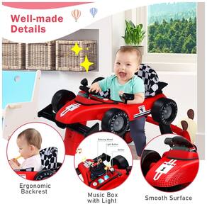 Andador de bebê multiuso 4 em 1 este andador de atividade para bebês apresenta um design 4 em 1, que inclui modo de andador de bebê, modo push behind, modo de carro push e modo de carro de brinquedo rolante, atendendo muito às necessidades de seu pequeno um em diferentes estágios. É adequado para bebês de 6 a 18 meses de idade. Construído para segurança e conforto este andador de bebê de atividade está equipado com um pára choque de segurança na parte de trás, que protege a cabeça do seu filho se ele escorregar para trás. Da mesma forma, existem 5 almofadas de escada antiderrapantes e 4 rodas antiderrapantes adicionam segurança adicional. E a almofada de assento lavável e respirável com encosto ergonômico traz conforto ideal. Altura e velocidade ajustáveis para crescer com o seu filho, este andador multifuncional vem com 3 alturas ajustáveis para que você possa ajustá lo de acordo com a mudança de altura do bebê. Além disso, a velocidade das 2 rodas traseiras pode ser ajustada com base na força do seu filho. Design interativo com volante, câmbio, 2 botões de luz com luzes diferentes e 2 espelhos retrovisores de brinquedo, este andador simula a aparência de um carro de corrida, satisfazendo a curiosidade do seu filho por explorar e aprender cedo. E a música torna a diversão ainda mais longa. Requer 2 pilhas AA não incluídas. Projetado para economia de espaço com o design dobrável, este andador de atividades é conveniente para zenar contra a parede ou embaixo da cama, sofá para economizar espaço em sua casa quando estiver fora de uso. Além disso, a instalação é fácil com instruções detalhadas e fáceis de entender Marca: Não Informado