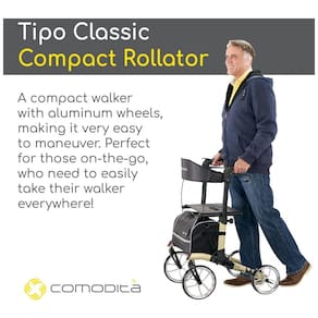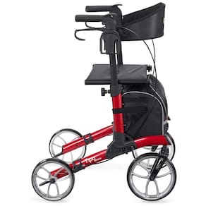 Construção Dobrável Dupla Com construção patenteada e suportes reforçados para as rodas frontais, este andador com assento oferece um assento de 44,4 cm (17,5 polegadas) e suporta uma capacidade de peso de até 136 kg. A altura recomendada do usuário é de 1,62 m a 1,93 m (5'4" a 6'4"). Peso do andador: 8,4 kg.