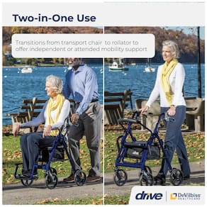Componentes Ajustáveis: O encosto pode ser movido de frente para trás, transformando o andador em uma cadeira de transporte. Os apoios de braço dobráveis com trava e o apoio para os pés, utilizados no modo cadeira de transporte, podem ser facilmente removidos e guardados quando o andador estiver em uso.