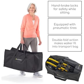 Pneus Todo Terreno - Equipado com rodas de 30,5 cm na frente e 25,4 cm na parte traseira, este andador possui pneus pneumáticos para máxima aderência e tração em diversos terrenos, como superfícies internas e externas, trilhas irregulares, cascalho, pedras e areia firme.