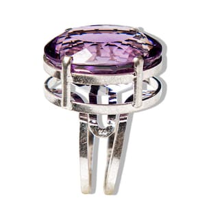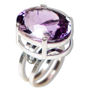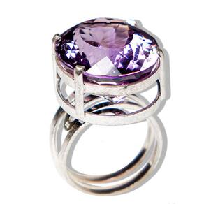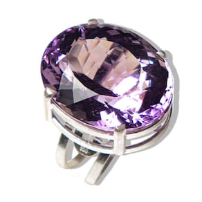 Anel de Prata 950 com Pedra Ametista Super Extra Natural Descubra a elegância atemporal do nosso Anel de Prata 950 com Pedra Ametista Super Extra Natural. Este anel é uma peça exclusiva, projetada para realçar sua beleza única, feito manualmente com cuidado e atenção aos detalhes. Detalhes do Produto:\nNome da Pedra: Ametista Super Extra Cor da Pedra: Roxo vibrante (foto autêntica) Lapidação: Gema em formato cabochão facetado, que reflete a luz de forma deslumbrante Medidas da Pedra: 22 x 18mm Medida do Aro: Ajuste para qualquer dedo, garantindo conforto e praticidade Peso Total da Joia: 50ct\nMaterial:\nMetal: Prata 950, conhecida por sua qualidade superior e durabilidade\nCaracterísticas da Pedra: A Ametista é um mineral autêntico de garimpo brasileiro, valorizada por suas propriedades espirituais e estéticas. Cada pedra é única e pode apresentar variações de tonalidade e grafismos, além de pequenas inclusões que são características normais de gemas naturais. Recomendamos a hidratação com óleo mineral para preservar sua beleza. Por que Escolher Este Anel?\nDesign Exclusivo: Cada peça é lapidada manualmente, garantindo um toque pessoal e artesanal. Versatilidade: Ideal para qualquer ocasião, seja para o dia a dia ou eventos especiais. Presente Perfeito: Surpreenda alguém especial ou presenteie-se com esta joia marcante. Marca: CristaisdeCurvelo