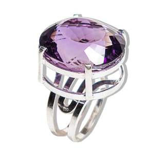 Anel de Prata 950 com Pedra Ametista Super Extra Natural Descubra a elegância atemporal do nosso Anel de Prata 950 com Pedra Ametista Super Extra Natural. Este anel é uma peça exclusiva, projetada para realçar sua beleza única, feito manualmente com cuidado e atenção aos detalhes. Detalhes do Produto:\nNome da Pedra: Ametista Super Extra Cor da Pedra: Roxo vibrante (foto autêntica) Lapidação: Gema em formato brilhante, que reflete a luz de forma deslumbrante Medidas da Pedra: 21 x 20mm Medida do Aro: Ajuste para qualquer dedo, garantindo conforto e praticidade Peso Total da Joia: 59ct\nMaterial:\nMetal: Prata 950, conhecida por sua qualidade superior e durabilidade\nCaracterísticas da Pedra: A Ametista é um mineral autêntico de garimpo brasileiro, valorizada por suas propriedades espirituais e estéticas. Cada pedra é única e pode apresentar variações de tonalidade e grafismos, além de pequenas inclusões que são características normais de gemas naturais. Recomendamos a hidratação com óleo mineral para preservar sua beleza. Por que Escolher Este Anel?\nDesign Exclusivo: Cada peça é lapidada manualmente, garantindo um toque pessoal e artesanal. Versatilidade: Ideal para qualquer ocasião, seja para o dia a dia ou eventos especiais. Presente Perfeito: Surpreenda alguém especial ou presenteie-se com esta joia marcante. Marca: CristaisdeCurvelo