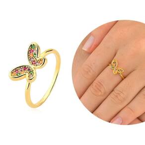 O Anel 19 Borboleta Zircônias Coloridas Semijoia Lizzy Fatin é uma peça deslumbrante que adicionará um toque de elegância ao seu visual.