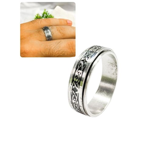 Anel Dedeira 7Mm Masculino Prateado Preto Desenhos Runas